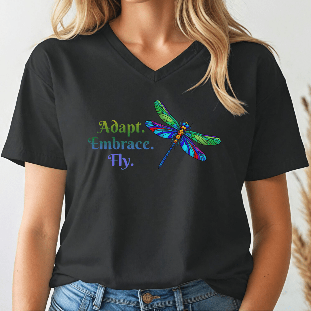 A vibrant design that celebrates resilience and growth, this tee features a colorful dragonfly paired with the words Adapt. Embrace. Fly. A reminder that transformation is powerful and beautiful.